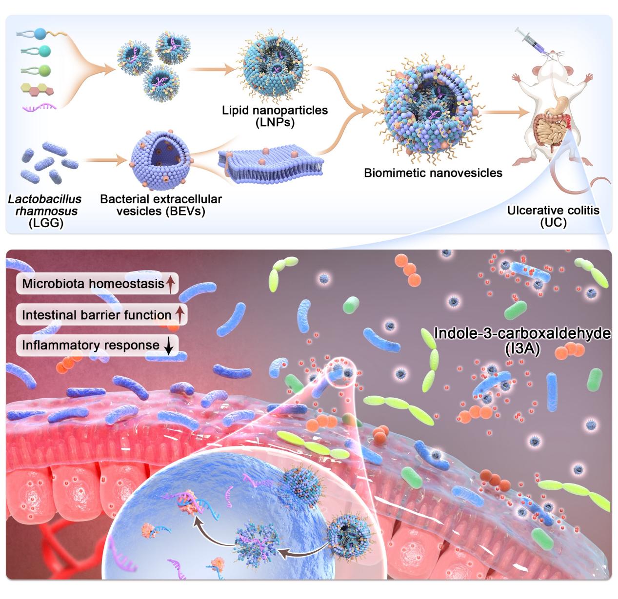 近日,我院项目负责人戚建平课题组在Science Advances期刊发表最新研究成果“miRNA-loaded biomimetic nanoparticles orchestrate gut microbe to ameliorate inflammatory bowel disease”,报道了一种能够对共生菌鼠李糖乳杆菌进行改造的仿生纳米颗粒。通过将鼠李糖乳杆菌来源的细菌胞外囊泡(Bacterial extracellular vesicles, BEV)与脂质纳米粒(Lipid nanoparticles, LNP)进行功能化结合,制备了细菌胞外囊泡-脂质纳米粒(BEV-LNPs)。该纳米载体对鼠李糖乳杆菌的靶向效率显著高于大肠杆菌。体内外稳定性实验表明,相较于传统脂质纳米粒,BEV-LNPs在模拟生理介质及胃肠道环境中展现出更佳的稳定性。将该纳米载体与5-ASA联合使用时,促进了鼠李糖乳杆菌的增殖并增加了吲哚-3-甲醛的生成量,在急性和慢性结肠炎模型中均显著改善了治疗效果,有效减轻肠道炎症,修复受损肠道上皮屏障,并促进肠道菌群重新恢复平衡。